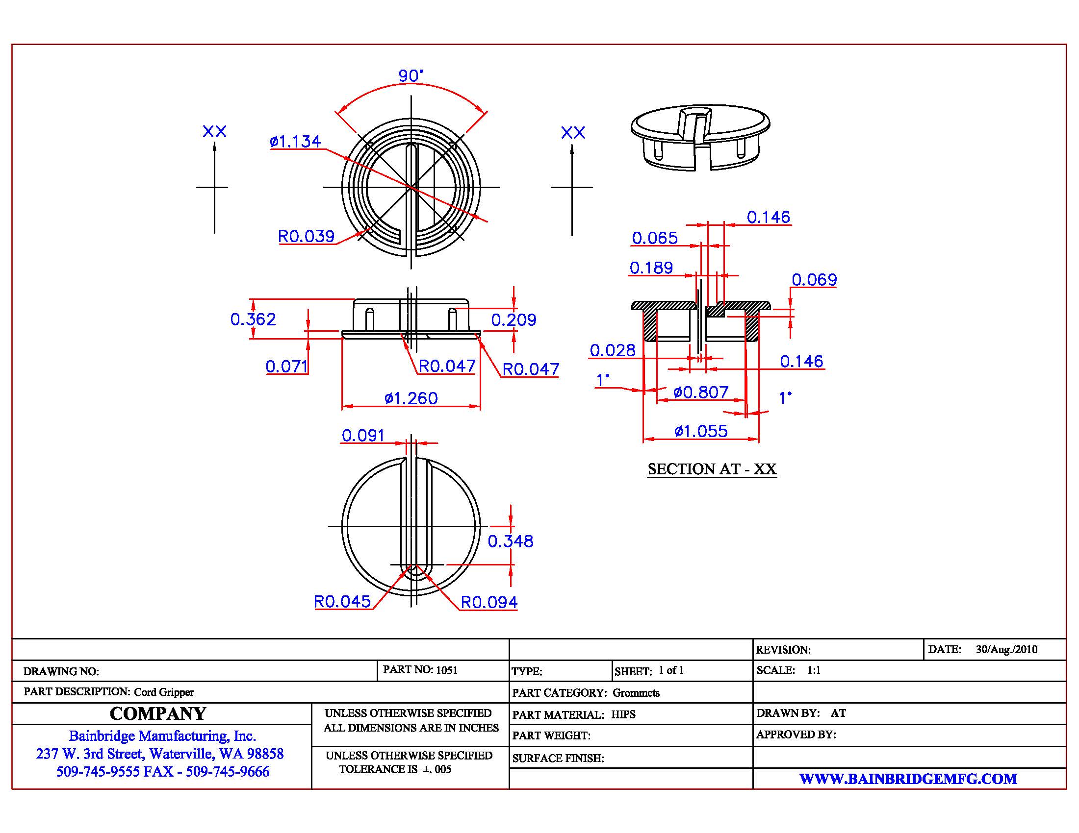 Plastic Cord Grommet fits in 1-1/8″ diameter hole, rim is 1/4″ deep.