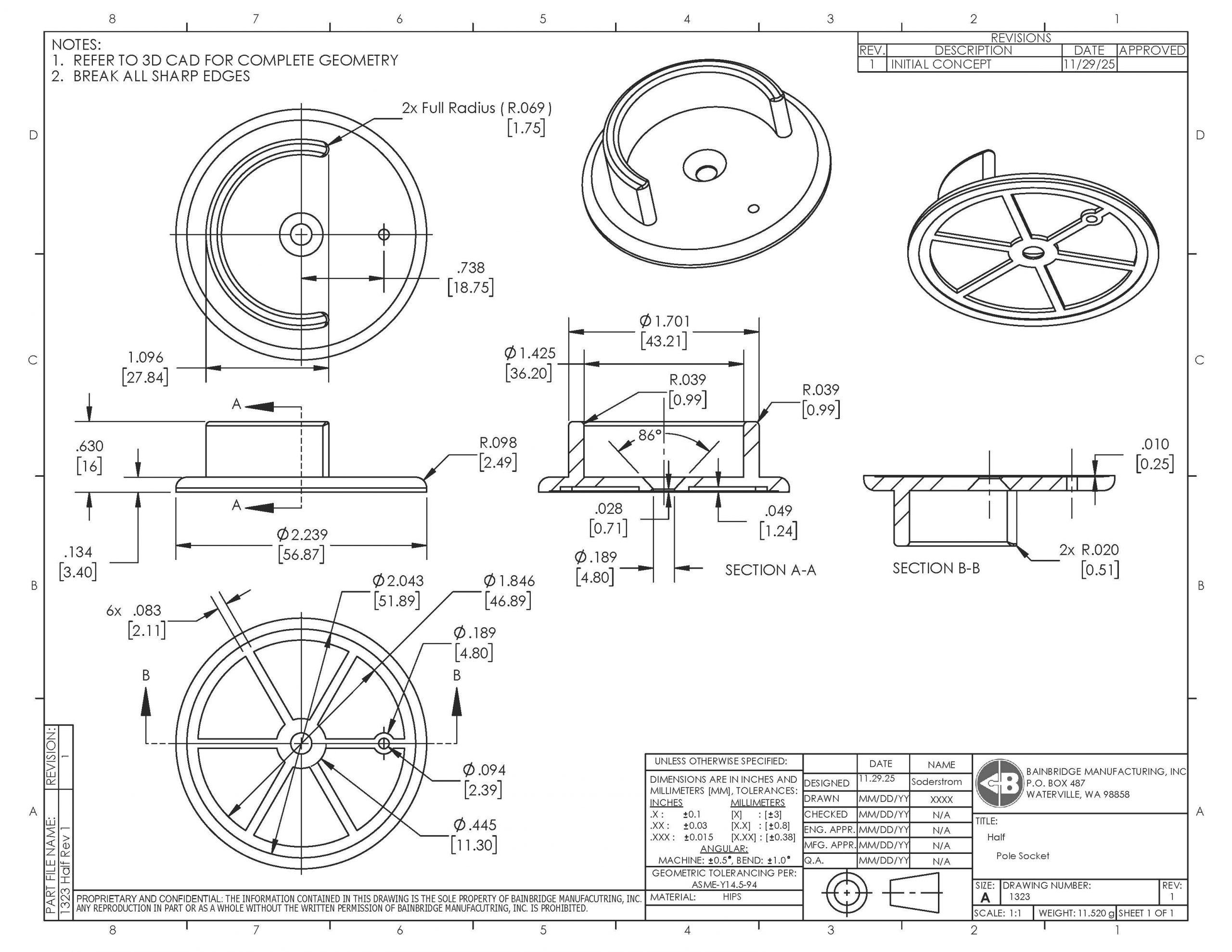 Plastic pole socket set fits 1-3/8″ wood pole. This is a set of half and whole pole sockets; each side is packaged separately without screws. 50 sets = $34.00 Screw suggestion would be #8 X 3/4″ Phillips.