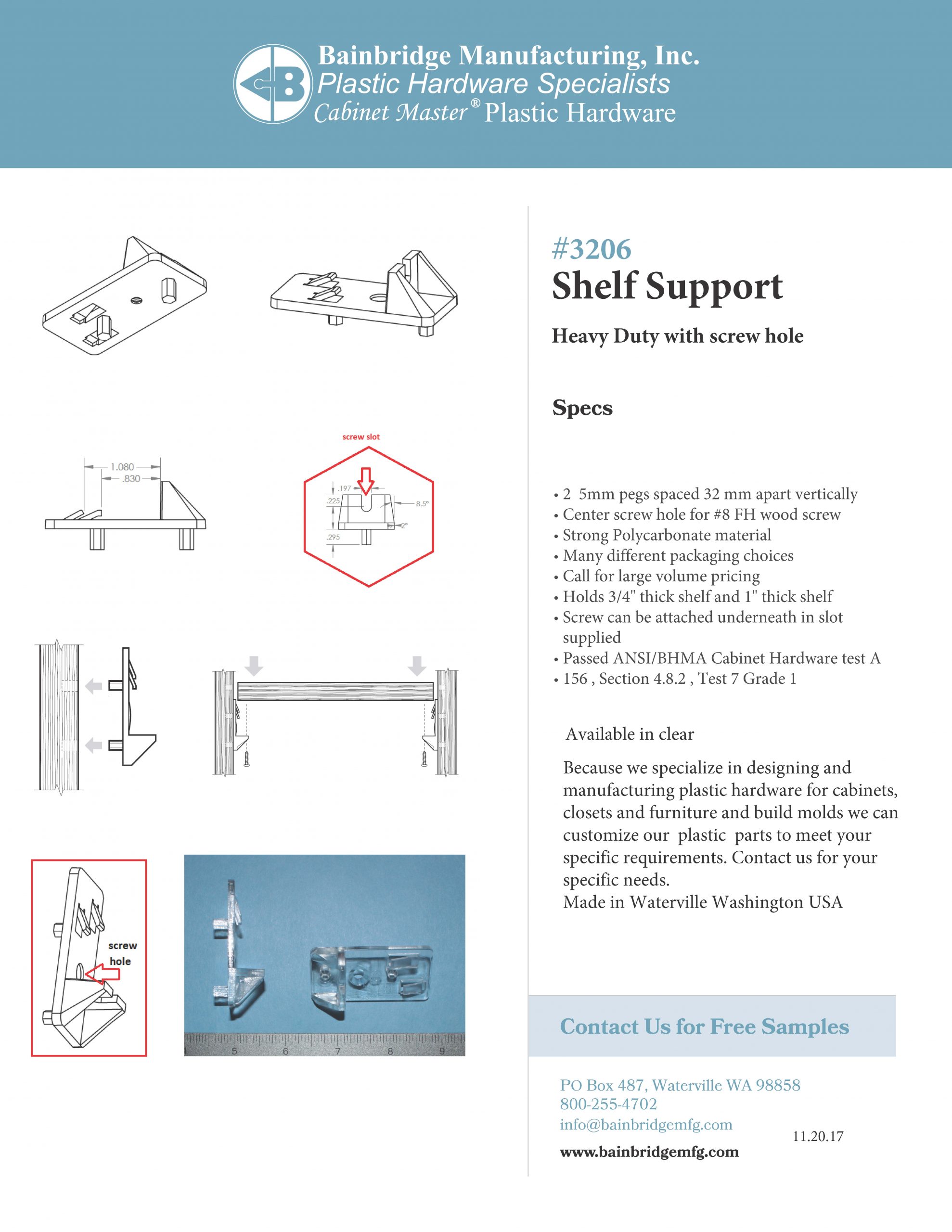 Heavy-Duty institutional locking shelf support with dual 5mm pegs spaced 32mm apart and added screw hole. Designed for 3/4″ or 1″ thick shelving, commonly found in Commercial and Institutional Furniture.