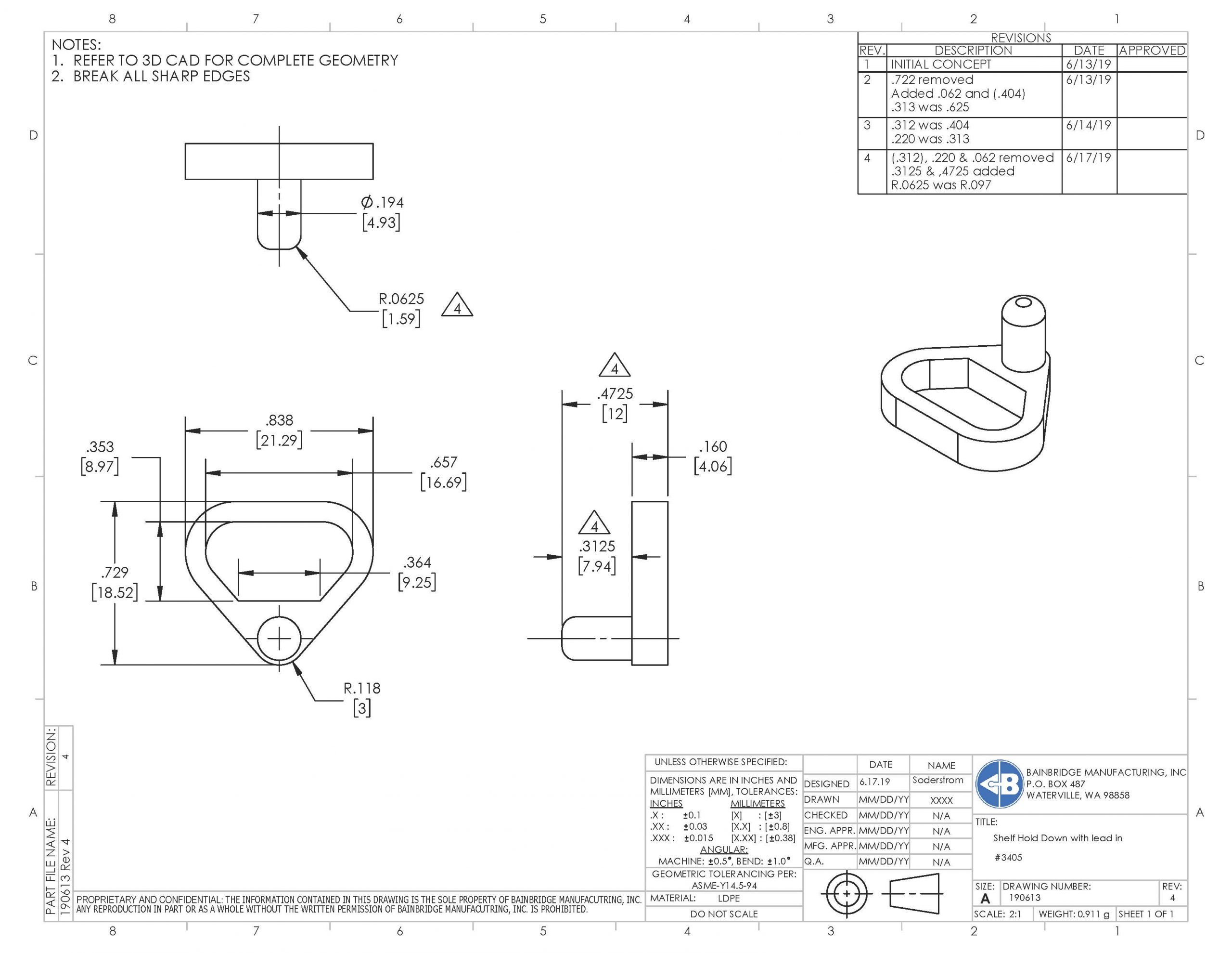 Shelf securing hold down 1/8″ clip with 5mm peg and lead-in. For 3/4″ shelf.