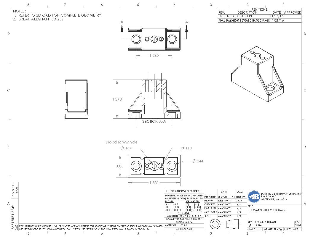 35mm Thick Drawer Slide Spacer With 1/4″ Holes 32mm Apart, with .157″ center hole for wood screw.