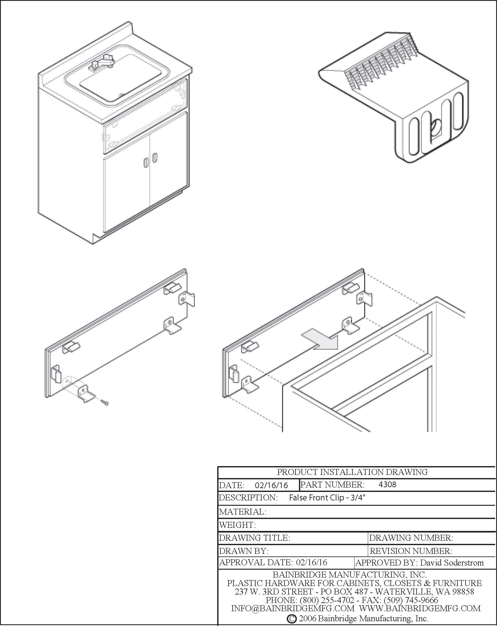 Plastic False Front Clip for attaching false front panel to cabinet with 3/4″ thick face frame. Install with screw. *Formerly Part #1987