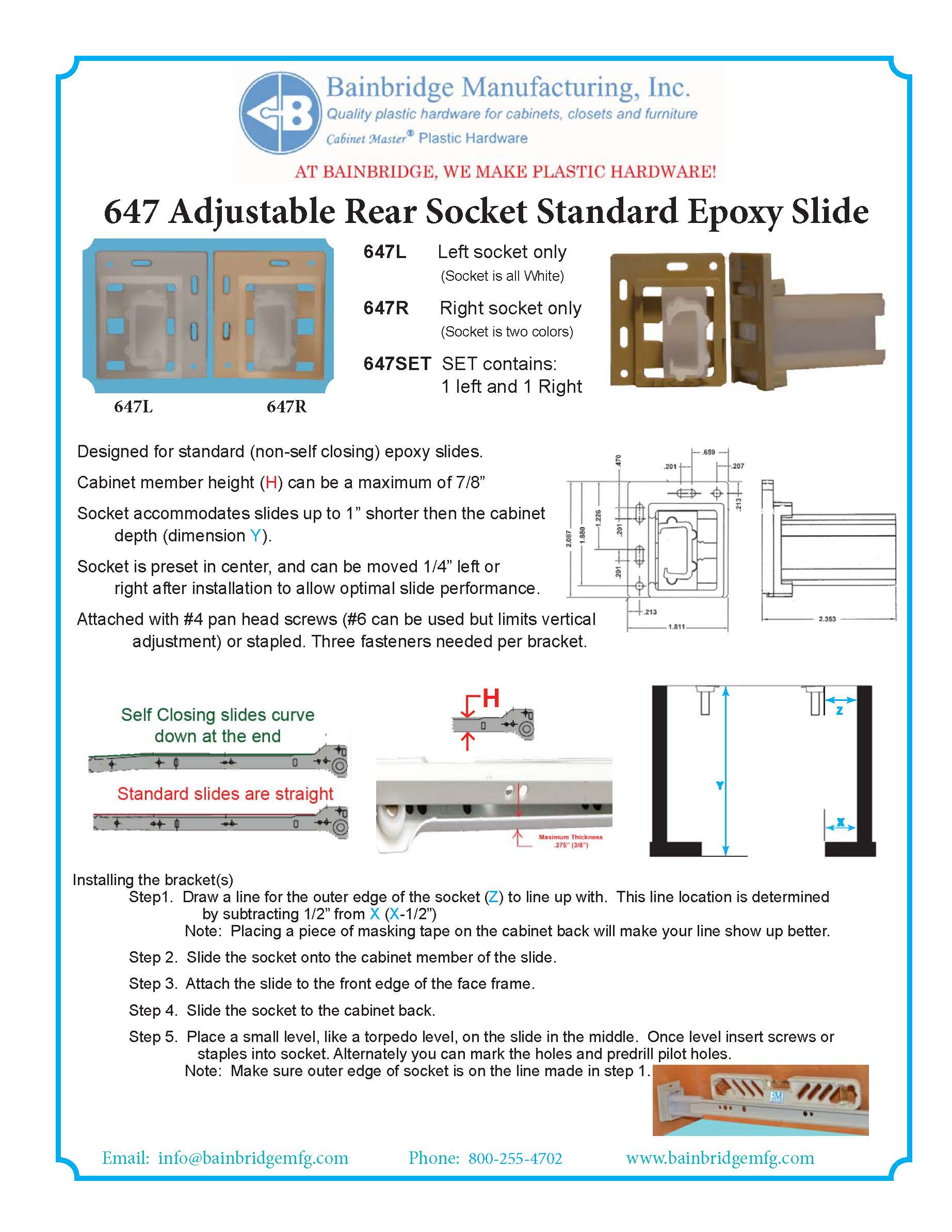 5/16″ X 13/16″ X 2-1/8″ Adjustable Socket for Euro Slides. Staple or screw in place. This is a set of left and right sockets; each side is packaged separately. This also come in standard and self-closing varieties.